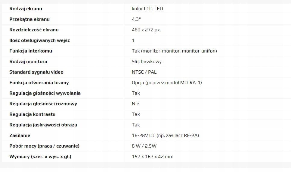 CDV-43K(DC) to monitor do systemów analogowych COMMAX. Posiada wysokiej jakości cyfrowy ekran 4,3" z podświetleniem LED dzięki czemu wyświetlany obraz jest kontrastowy i wyraźny. Obsługuje jedno wejście - kamery jednoabonentowe serii DRC-4xxx lub wieloabonentowe DRC-nAC2, DRC-nUC. Dodatkowe gniazdo interkomowe umożliwia nawiązanie komunikacji wewnętrznej pomiędzy kilkoma odbiornikami wewnątrz lokalu (funkcja interkomu),możlliwość sterowania automatyką bramową (poprzez moduł MD-RA-1). Zasilanie 16-28V DC (np. zasilacz RF-2A)