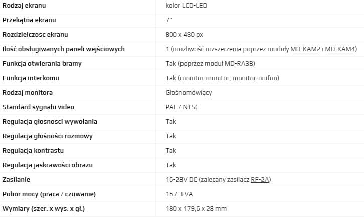 - obsługa jednego panelu wejściowego (możliwość rozszerzenia poprzez moduły MD-KAM2 i MD-KAM4)