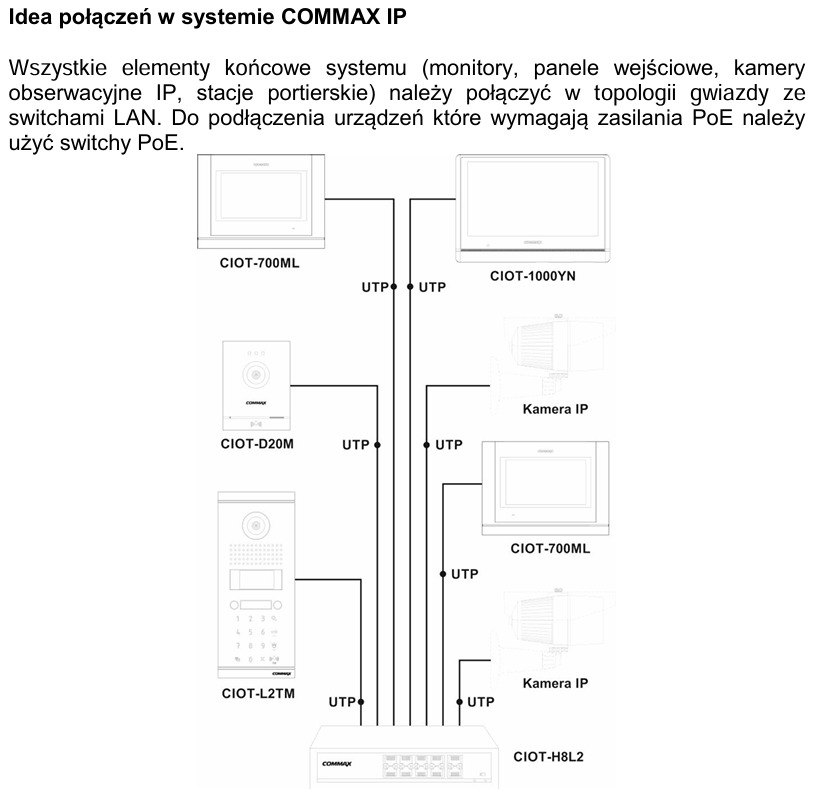 Switch CIOT-H8L2 to 10-portowy switch PoE przeznaczony do zasilania urządzeń IP, w szczególności systemu wideodomofonowego IP COMMAX. Switch na portach od 1 do 8 posiada funkcję automatycznej detekcji urządzeń zasilanych w standardzie PoE. Porty 9 i 10 oznaczone jako UPLINK służą do podłączenia kolejnych urządzeń sieciowych. Wbudowany zasilacz, sygnalizacja zasilania, sygnalizacja EXT (zwiększenie zasięgu).