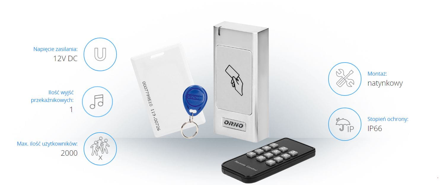 Czytnik zbliżeniowy umożliwia realizację elektronicznej kontroli dostępu (drzwi) przy zastosowaniu kart i breloków zbliżeniowych, pracuje na częstotliwości 125kHz, współpracuje z zamkami elektromagnetycznymi. 1 wyjście przekaźnikowe oraz 1 przekaźnik do dzwonka, obsługa do 2000 użytkowników, możliwość zaprogramowania czasu otwarcia drzwi od 1 do 99 sekund, automatyczna blokada po nieprawidłowych próbach dostępu, ochrona antysabotażowa,obudowa hermetyczna (IP66) umożliwia montaż wewnątrz i na zewnątrz, wskaźnik diodowy LED.