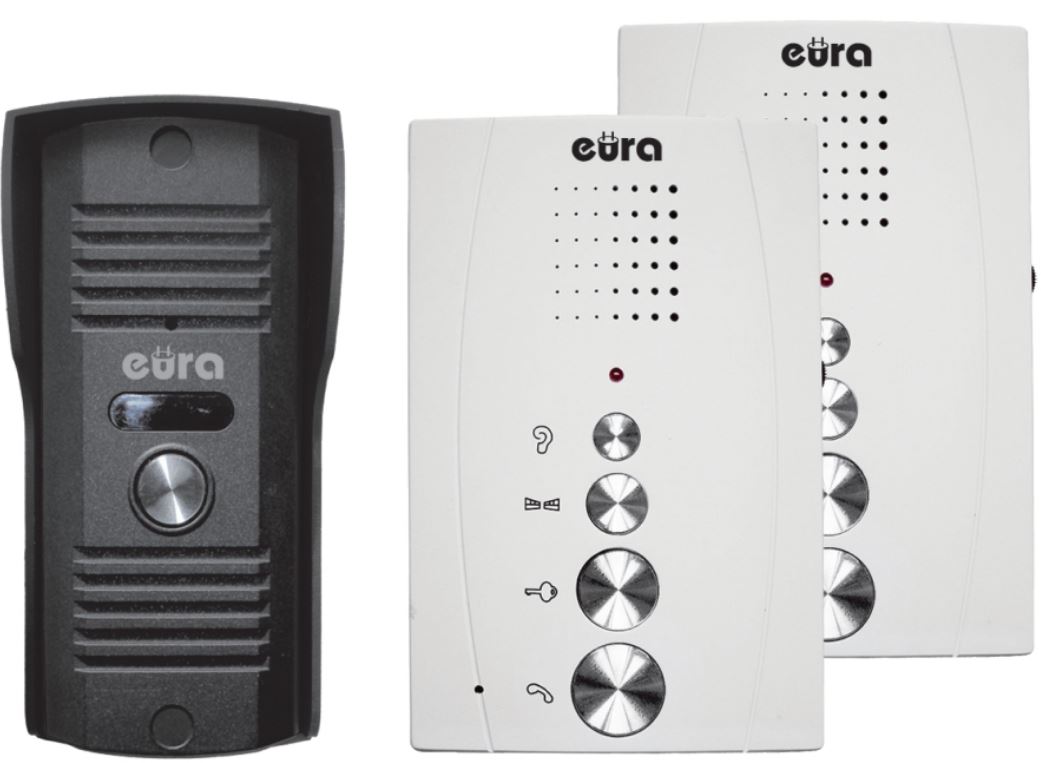 Zestaw domofonowy - Eura ADP-51A3 Difesa, wyposażony jest w dwa białe unifon głośnomówiące, małogabarytową kasetę zewnętrzną oraz zasilacz 12 V DC.