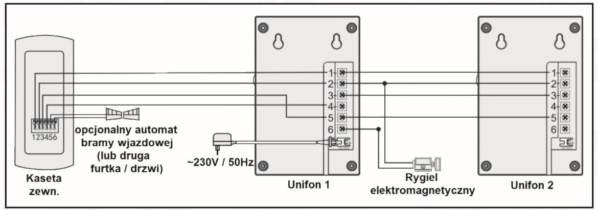 Unifony bezsłuchawkowe posiadają funkcję obsługi dwóch wejść, tym samym umożliwią otwieranie furtki oraz np. bramy. Ponadto wyposażone są w przycisk interkomu, przycisk dyskretnego podsłuchu otoczenia kasety zewnętrznej i regulację głośności rozmowy.