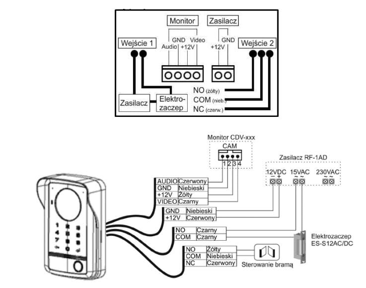 - instalacja czteroprzewodowa + obwód elektrozamka + obwód bramy