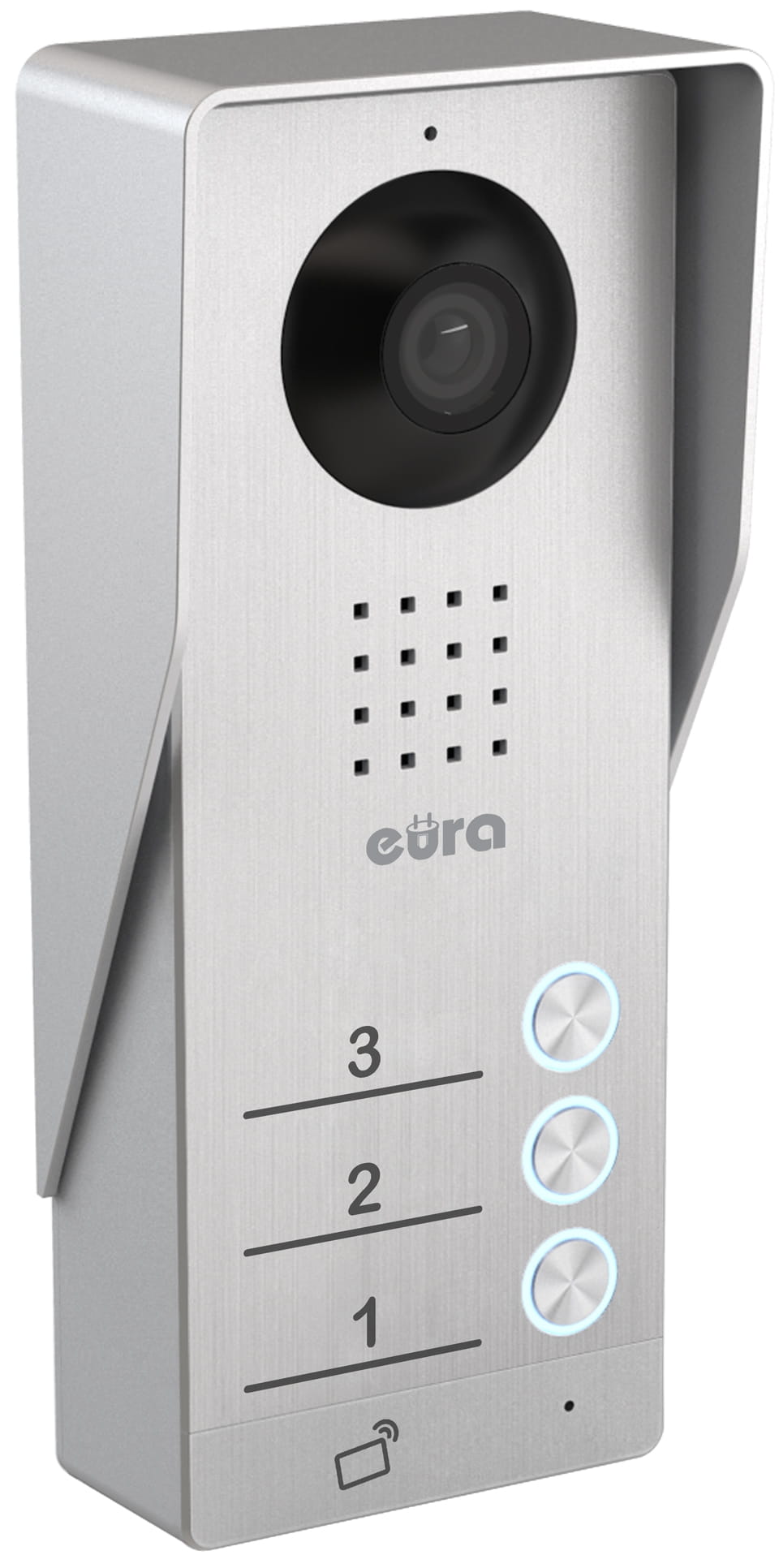 Trójrodzinna kaseta zewnętrzna Eura VDA-93A3 wyposażona jest w 6 diód LED oraz czujnik zmierzchowy, co umożliwia dyskretny podgląd w nocy. Kasetę wyposażono w kamerę rejestrującą obraz w rozdzielczości 500 TVL z obiektywem o polu widzenia 60°. Wejście na posesje może być realizowane za pomocą breloków zbliżeniowych.