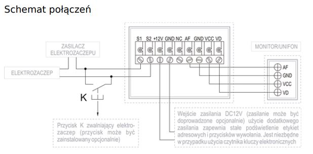 | STEROWANIE ELEKTROZACZEPEM | Wyjście przekaźnika w panelu zewnętrznym, zasilania elektrozaczepu (elektrozamka) z oddzielnego zasilacza np. AC8 |