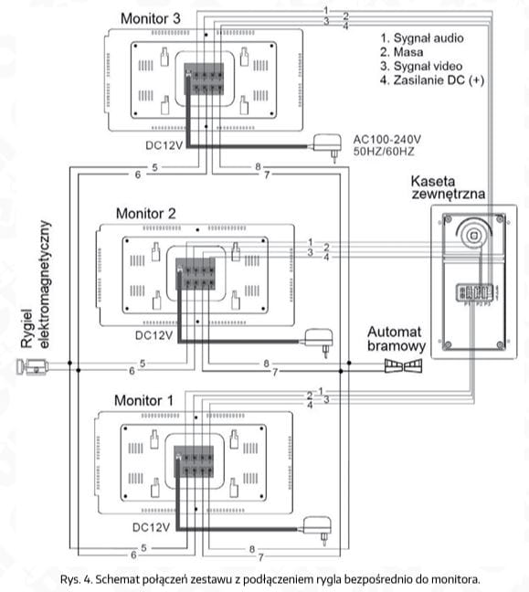 - Napięcie wyjściowe dla rygla elektromagnetycznego: 12 V DC