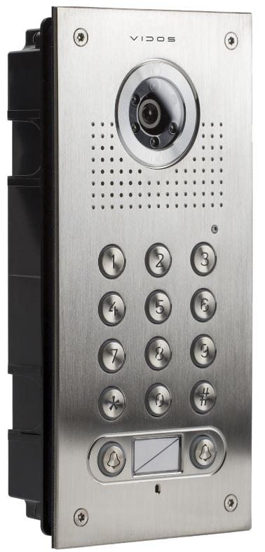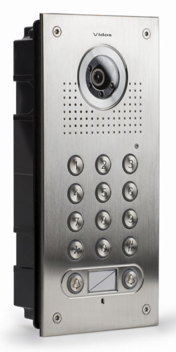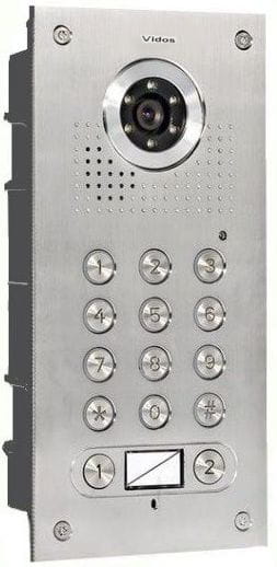 Kamera kolorowa dwurodzinna marki Vidos. Wandaloodporna stacja bramowa z płytą czołową wykonaną ze stali nierdzewnej z wbudowanym SZYFRATOREM. Sterowanie elektrozaczepem. Regulowany kąt obiektywu kamery w pionie i poziomie. Podświetlany przycisk wywołania, montaż podtynkowy. Kamera z doświetleniem diodami umożliwia widzenie w nocy.