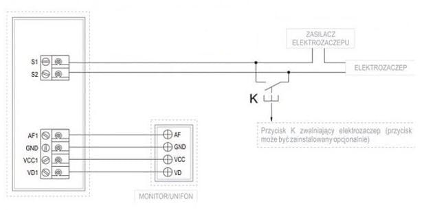 • sterowanie elektrozaczepem - wyjście przekaźnika w panelu zewnętrznym. Elektrozaczep wymaga oddzielnego zasilacza.