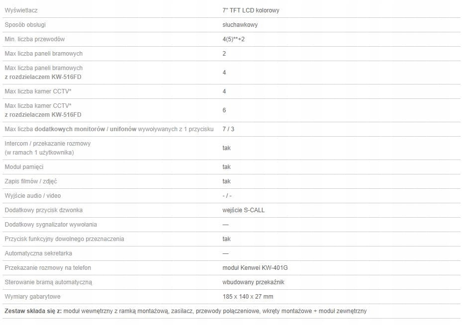 - możliwość podłączenia do dwóch paneli zewnętrznych (4 przy użyciu KW-516FD)
