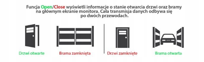 Dodatkowo bramofon wyposażony jest w specjalne wejścia dla kontaktronów (funkcja Open/Close), które pozwolą przekazać do monitora informacje o stanie otwarcia drzwi oraz bramy, monitor przetwarza te informacje i wyświetla je na głównym ekranie w postaci ikon, funkcja Open/Close jest bardzo wygodna i przydatna jeśli brama wjazdowa jest poza