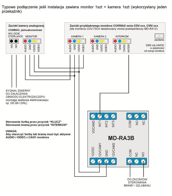 Moduł przekaźnikowy MD-RA3B przeznaczony jest do stosowania w instalacjach niskonapięciowych. Służy do sterowania, (sygnalizowania) dodatkowymi przekaźnikami NO/NC za pomocą przycisku interkomu w wideodomofonach analogowych COMMAX.