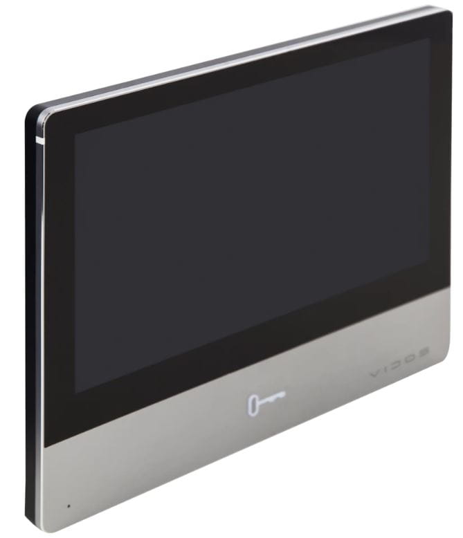 Wewnętrzna jednostka systemu wideodomofonowego VIDOS ONE. Monitor umożliwia komunikację ze stacją bramową, podgląd obrazu ze wszystkich kamer IP w systemie oraz zarządzanie czujnikami alarmowymi zintegrowanymi z wideodomofonem.