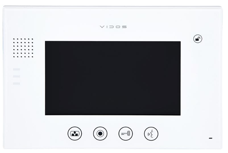 Głośnomówiący, bezsłuchawkowy monitor wideodomofonowy. Najpopularniejszy z modeli Vidos wyróżnia się wyjątkowym designem i funkcjonalnością. Monitor posiada 7″ kolorowy ekran panoramiczny TFT LCD. Przedni panel wykonany z wysokiej jakości tworzywa ‚nano glass’ zapewniającego nowoczeny wygląd i bezpieczeństwo. Zaprojektowany i wykonany z wielką precyzją i dbałością o detale. M670 posiada dotykowe, podświetlane klawisze sterujące. Obsługuje 2 stacje bramowe (2 stacje lub 1 stacja + kamera CCTV). Możliwy podgląd z kamery. Monitor wyposażony jest w funkcję interkomu i przekazywania rozmowy. System można rozbudować o dodatkowe 3 monitory lub unifony. Sterowanie elektrozaczepem i bramą automatyczną.