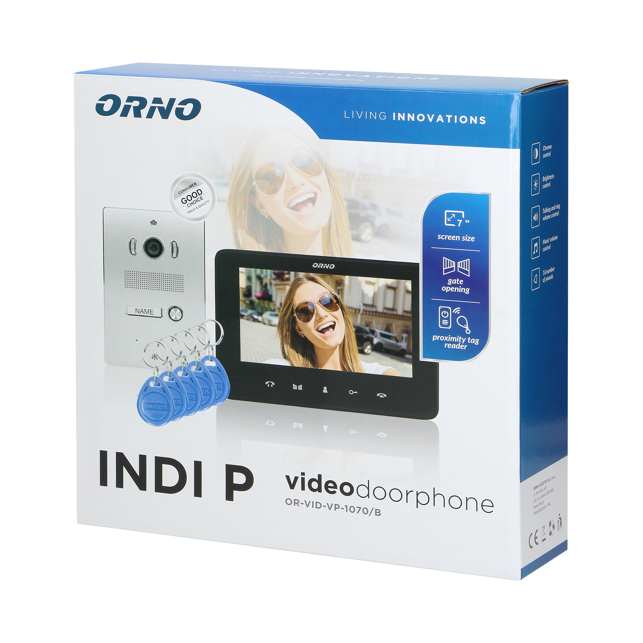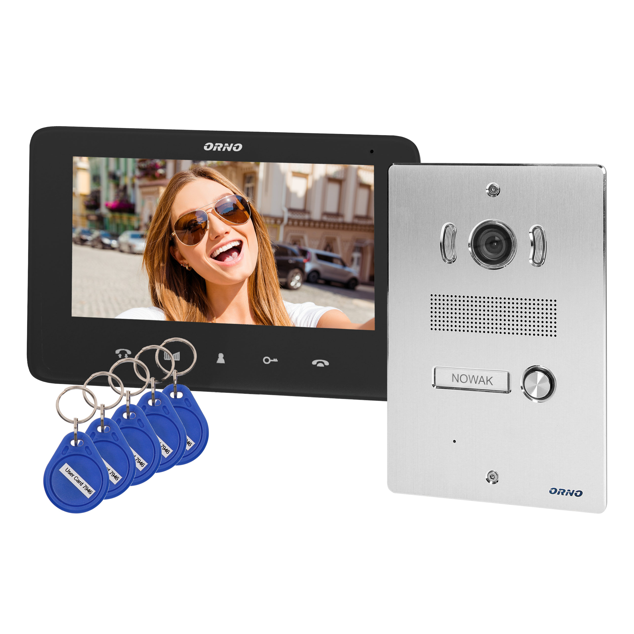 Zestaw wideodomofonowy kolorowy z ultra płaskim monitorem bezsłuchawkowym (LCD 7˝) oraz dotykowym panelem monitora, zawierającym podświetlane przyciski. Parametry monitora (jasność i kolor, głośność rozmowy i dzwonka) są regulowane, a do wyboru jest aż 16 dźwięków dzwonka. Panel zewnętrzny z kamerą CMOS nadaje się do montażu podtynkowego. Dodatkowo posiada daszek ochronny w zestawie, miejsce na nazwisko, oświetlenie super jasnymi diodami LED, które zapewnia widzenie w nocy. Zestaw umożliwia otwieranie rygla za pomocą breloka zbliżeniowego. Posiada również dodatkową funkcję sterowania bramą oraz funkcję interkomu, po zastosowaniu dodatkowego monitora. Urządzenie zasilane jest prądem stałym z zasilacza do gniazdka 15V DC lub opcjonalnie z zasilacza na szynę DIN OR-VID-VP-1009ZD. Elektrozaczep o napięciu stałym 12V i poborze prądu nie większym niż 300mA nie wymaga dodatkowego zasilania.
