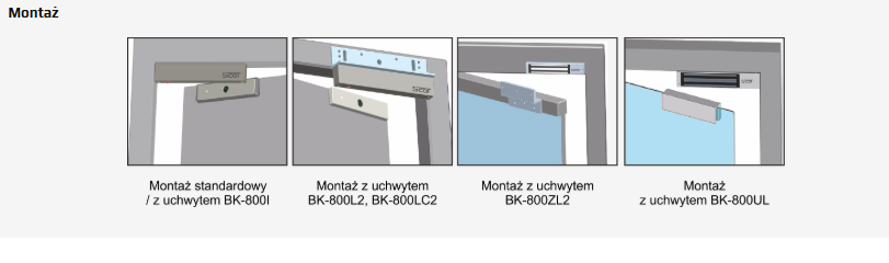 Dodatkowe uchwyty montażowe typu „L”, „ZL”, „UL” pozwalają na montaż zwory praktycznie na każdych drzwiach.
