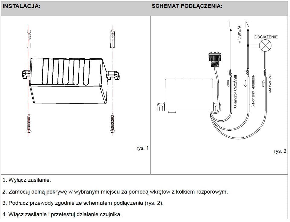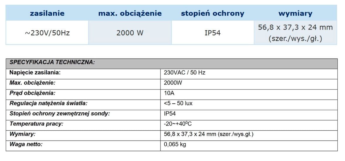 - regulacja czułości natężenia światła (LUX): <5-50lux