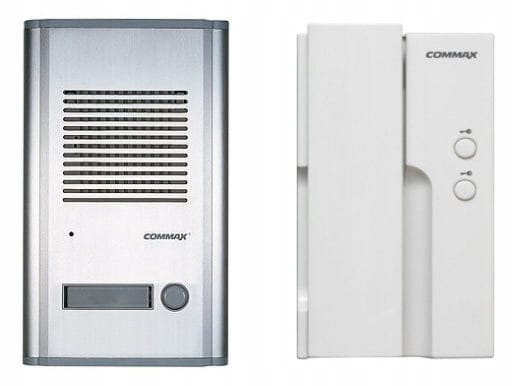 Domofon jednorodzinny marki Commax w skład zestawy wchodzą: stacja bramowa Commax DR-201A przeznaczona do montażu podtynkowego, szerokość 115 mm oraz słuchawka DP-2HPR z otwieraniem furtki oraz bramy, zasilanie 230V.