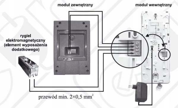 - Przewód łączący moduł wewnętrzny z ryglem elektromagnetycznym: Dwużyłowy o maksymalnej długości 60 metrów