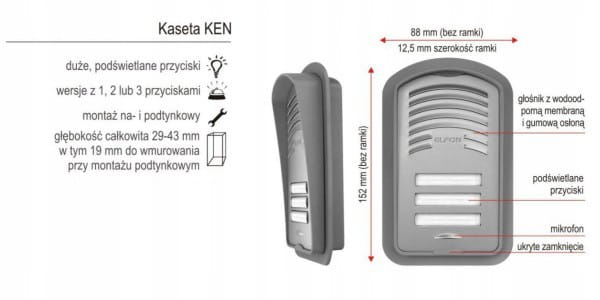 Kaseta wykonana jest z tworzywa udaroodpornego, a płyta czołowa z utwardzonego aluminium, co gwarantuje odporność na korozję i promienie UV. Zastosowana elektronika zapewnia optymalną jakość pracy urządzenia w szerokim zakresie temperatur. Można ją montować na- lub podtynkowo. Głębokość całkowita kasety wynosi 29-43 mm w tym 19 mm do wmurowania przy montażu podtynkowym.