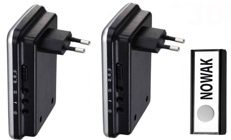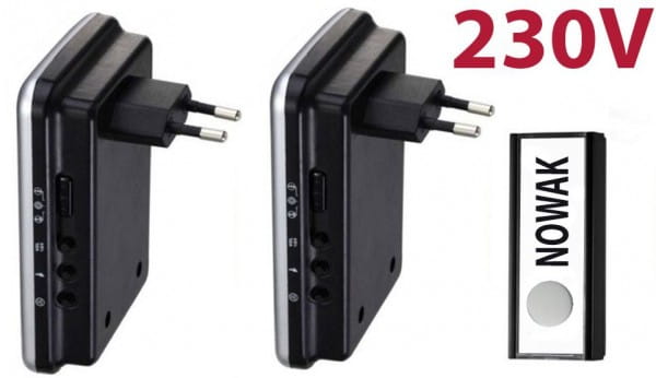 - 2 szt. odbiorniki (dzwonek) włączany bezpośrednio w gniazdo 230V, w kolorze czarnym z srebrną obwódką, IP 20,