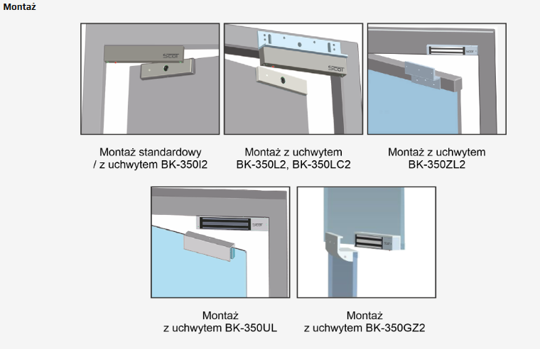 Dodatkowe uchwyty montażowe typu „L”, „ZL”, „UL” pozwalają na montaż zwory praktycznie na każdych drzwiach.