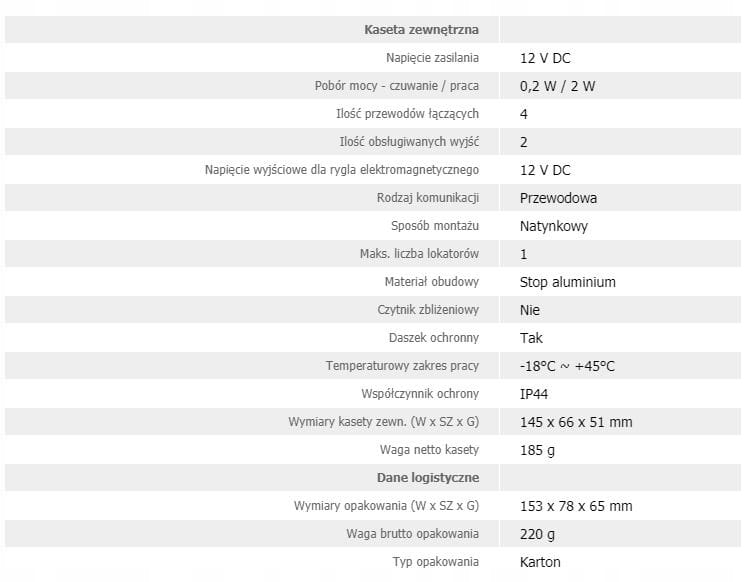 Moduł wykonany jest ze stopu aluminium co w połączeniu z daszkiem ochronnym zapewnia mu odporność na niekorzystne warunki atmosferyczne. Wyłącznie do montażu natykowego.