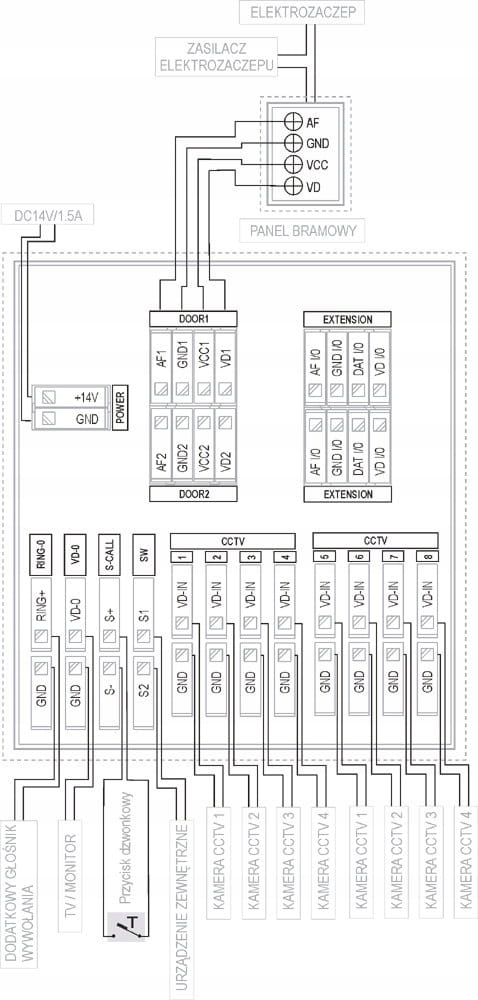 - możliwość bezpośredniego sterowania ryglem elektromagnetycznym służącym do otwierania drzwi