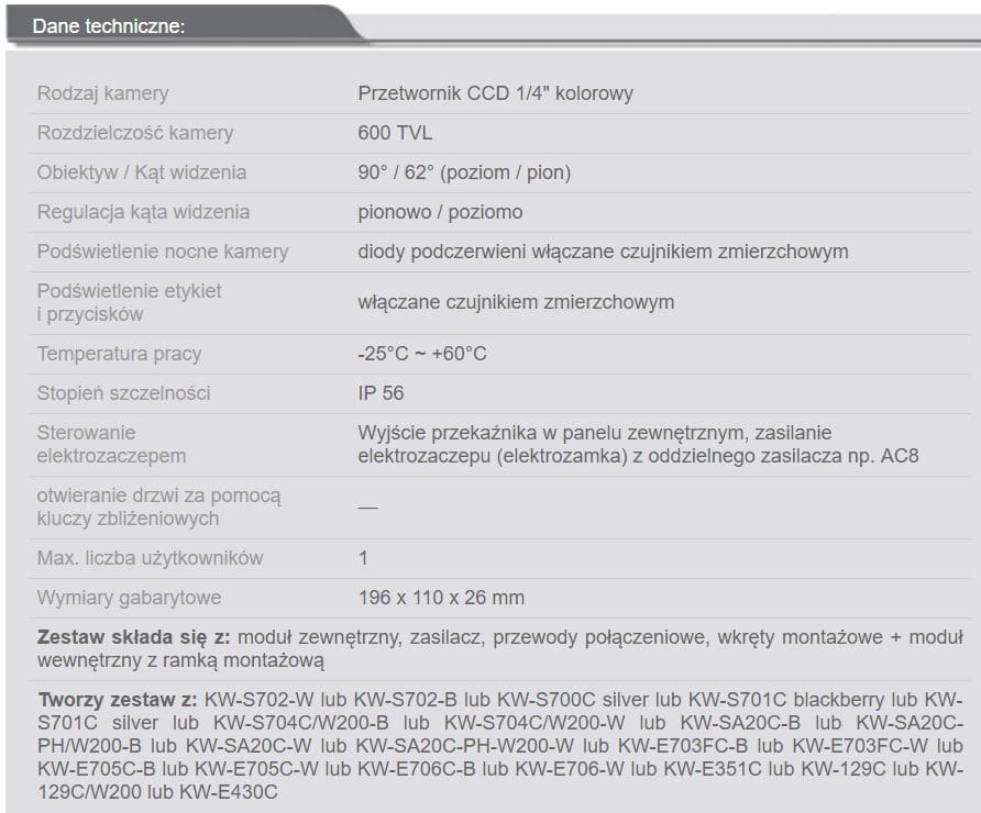 - tworzy zestaw wideofonowy z monitorem / monitorami KENWEI