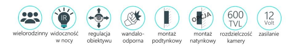 - Stacja bramowa została wyposażona w kolorową kamerę z możliwością regulacji w poziomie i w pionie w zakresie kilkunastu stopni.