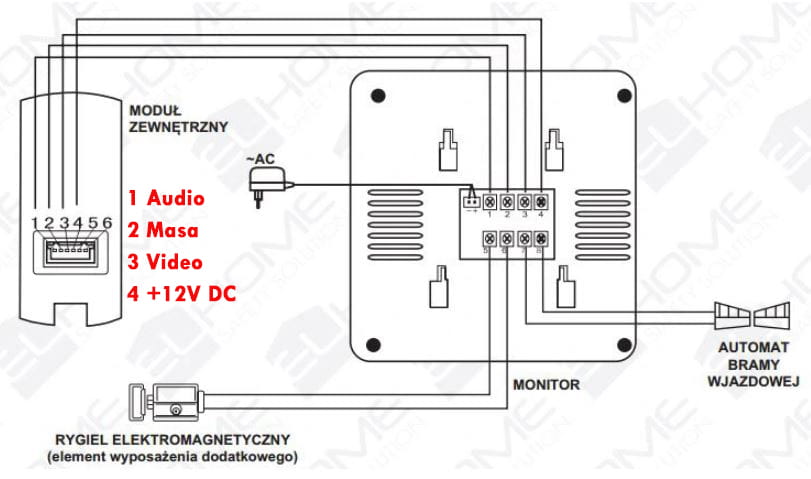 Połączenie z ryglem elektromagnetycznym powinno zostać przeprowadzone przewodem 2 x 0.75mm2 , podobnie w przypadku połączenia z opcjonalnym automatem bramy wjazdowej. Optymalnym rozwiązaniem będzie użycie jednego 4-żyłowego przewodu łączącego monitor z modułem zewnętrznym, jednego 2-żyłowego przewodu łączącego monitor z ryglem elektromagnetycznym oraz jednego 2-żyłowego przewodu łączącego monitor z automatem bramy wjazdowej.