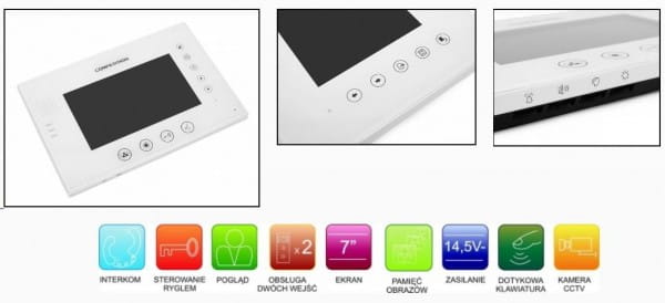 Monitor z funkcją otwierania furtki i bramy. Jest to monitor z wyświetlaczem 7", posiada możliwość regulacji jasności obrazu, kontrastu. Dostępny w kolorach obudowy czarnym oraz białym.