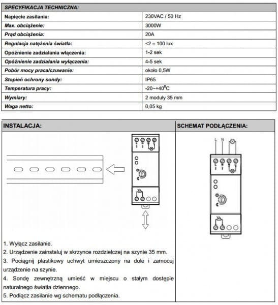 Urządzenie służy do automatycznego sterowania oświetleniem lub innymi odbiornikami elektrycznymi przy jednoczesnej oszczędności energii elektrycznej. Jego zadanie polega na załączaniu i rozłączaniu obwodu elektrycznego, jeżeli natężenie oświetlenia spadnie poniżej określonego poziomu. Potencjometr do regulacji natężenia światła. Montaż na szynie DIN. Zewnętrzna sonda wyposażona w kabel o długości ok. 1 m (2 × 0,5 mm2).