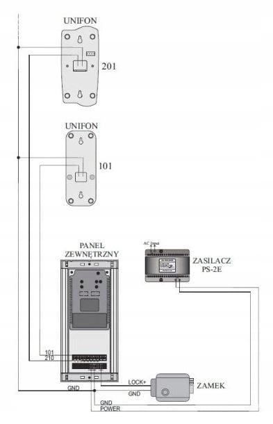 Połączenie pomiędzy panelem zewnętrznym a modułem audio - magistrala 4 żyły. Połączenie pomiędzy modułem audio a unifonami - 2 żyły.