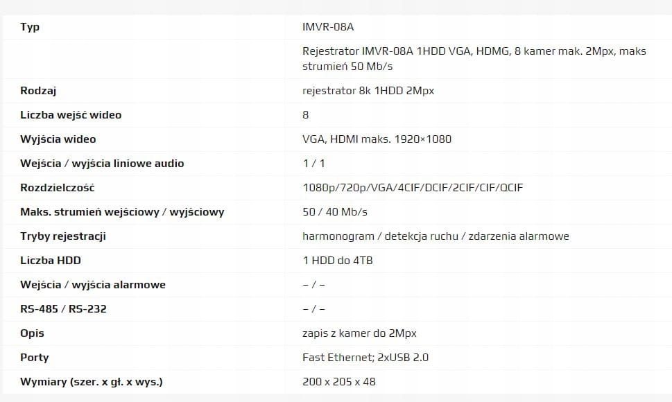 Rejestrator IMVR-08A umożliwia nagrywanie 8 kamer IP o rozdzielczości do 2 Mpx. Rejestrator posiada bardzo rozbudowane menu oraz funkcje sieciowe.
