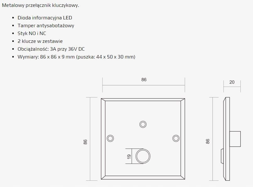 - Wymiary: 86 x 86 x 9 mm (puszka: 44 x 50 x 30 mm)