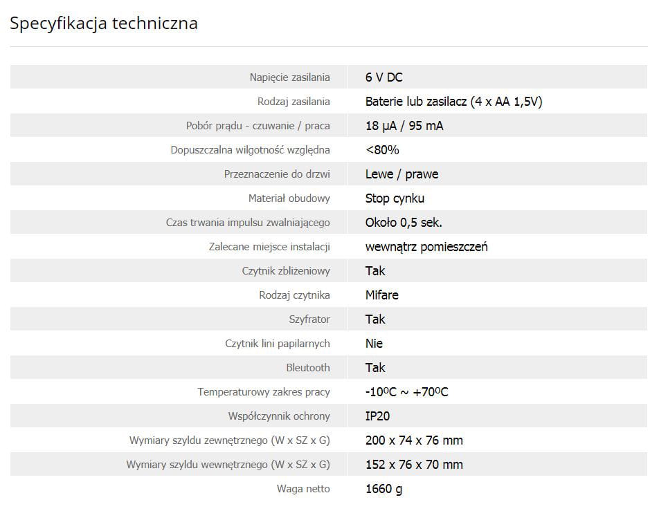 Na korpusie szyldu znajduje się dotykowy szyfrator z wbudowanym czytnikiem kart zbliżeniowych oraz modułem Bluetooth. Po zbliżeniu karty RFID do czytnika lub wpisaniu kodu do szyfratora, następuje podanie impulsu z modułu kontroli dostępu, po czym serwomotor odblokowuje przekładnię mechaniczną, umożliwiając tym samym otwarcie drzwi poprzez normalne przyciśnięcie klamki na szyldzie zewnętrznym. Okres oczekiwania na wciśnięcie klamki ustawiony jest fabrycznie na ok. 5 sekund, po tym czasie następuje ponowna blokada przekładni i przejście zamka w stan oczekiwania na podanie kolejnego impulsu.