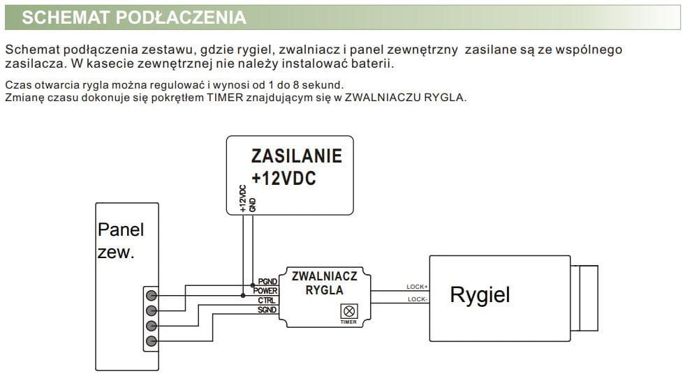 Napięcie zasilania zwalniacza rygla – 12 V DC