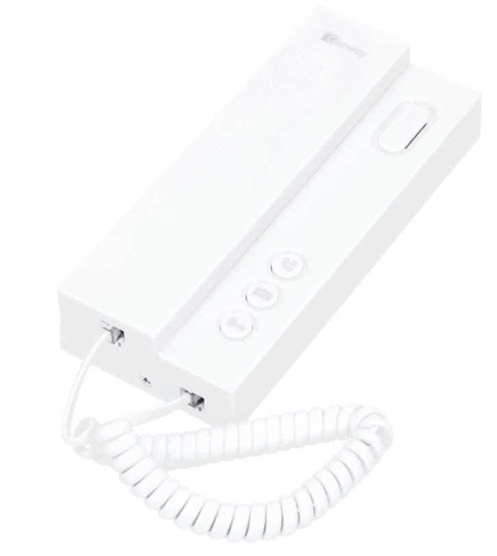 Słuchawka, unifon systemu wideodomofonowego serii F. Proste w użyciu urządzenie pozwalające na odbieranie połączeń w formie audio z paneli z serii F oraz na otwieranie furtki oraz wejścia za pomocą fizycznego, klikalnego przycisku. Dodatkowo możesz nawiązać połączenie typu interkom pomiędzy dwoma urządzeniami w mieszkaniu.
