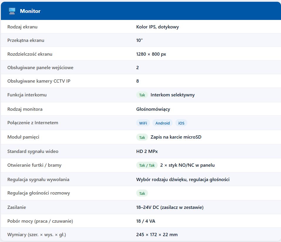 wideodomofon 10" Smart HD, wideodomofon głośnomówiący, monitor 10 cali dotykowy, kamera natynkowa HD, czytnik RFID, klawiatura PIN, sterowanie bramą i furtką, interkom selektywny, zapis wideo i zdjęć, obsługa CCTV IP, WiFi Tuya Smart, wideodomofon z aplikacją