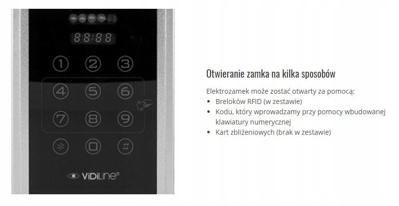 Panel wideodomofonowy do montażu na zewnątrz budynku natynkowo i podtynkowo. Posiada moduł kamery z diodamy podczerwieni, co umożliwia bezproblemową pracę w warunkach nocnych. Urządzenie posiada wbudowany czytnik RFID oraz szyfrator, dzięki czemu otwarcie elektrozamka może odbyć się przy użyciu breloka RFID, karty lub kodu. Otwieranie zamka czy też prowadzenie rozmowy odbywa się bez konieczności wywołania ze strony panela wewnętrznego.