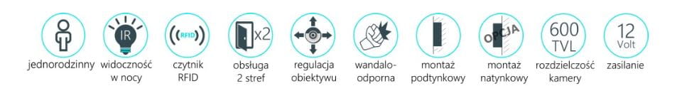 - Jednoabonentowa stacja bramowa z wbudowanym czytnikiem RFID umożliwiający otwieranie elektrozaczepu zbliżeniowo.