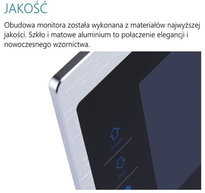 Monitor z 7″ kolorowym ekranem panoramicznym LCD o wysokiej rozdzielczości. M901 obsługuje 2 wejścia oraz 2 dodatkowe kamery CCTV (lub 1 wejście i 3 kamera CCTV). Funkcja korekcji obrazu jest dostępna osobno dla każdej z kamer. Monitor posiada funkcję pamięci zdjęć lub filmów z wizyt gości. Możemy wybrać czy po naciśnięciu przycisku wybierania monitor zrobi zdjęcie czy nagra krótki klip. Całość zapisywana jest na karcie micro SD. Możliwość podpięcia czujnika alarmowego do każdej z kamer CCTV, który po zareagowaniu uruchamia ustaloną przez nas funkcję w monitorze – nagrywa film z tej kamery lub zapisuje zdjęcie. Dużym udogodnieniem jest możliwość wykonania sekwencyjnego podglądu ze wszystkich kamer, rozpoczęcia rozmowy i otwarcia elektrozaczepu bez konieczności wywołania z panelu zewnętrznego. Wykonany ze szczególną dbałością o szczegóły i użyte materiały. Obudowa to niezwykłe połączenie szkła i frezowanego aluminium.