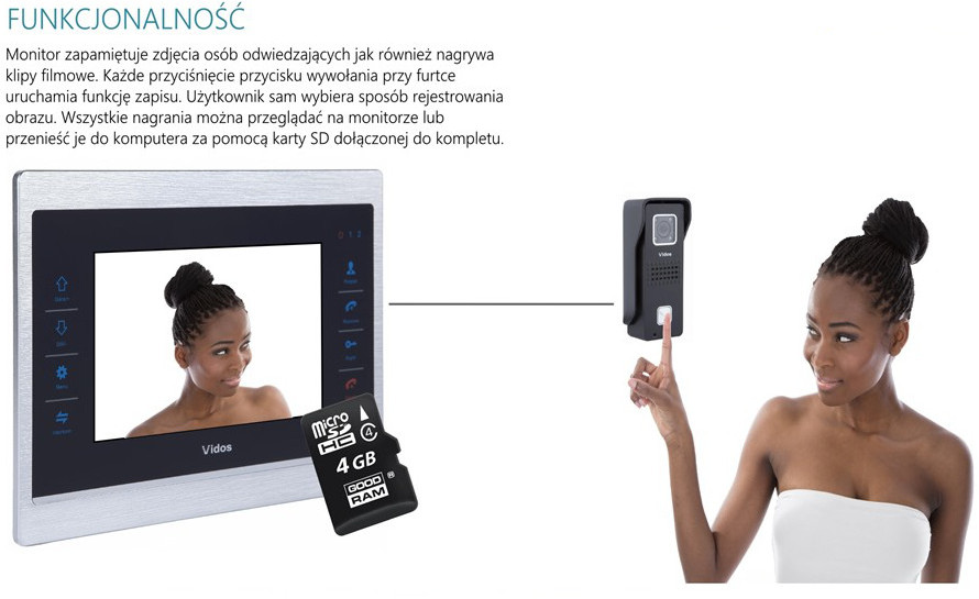 Zestaw wideodomofonowy firmy Vidos. Monitor posiada funkcję pamięci zdjęć lub filmów z wizyt gości. Gwarancja 24 miesiące. Sterowanie elektrozaczepem i bramą automatyczną.