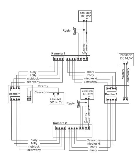 Poniżej schemat podłączenia dwóch kamer i dwóch monitorów: