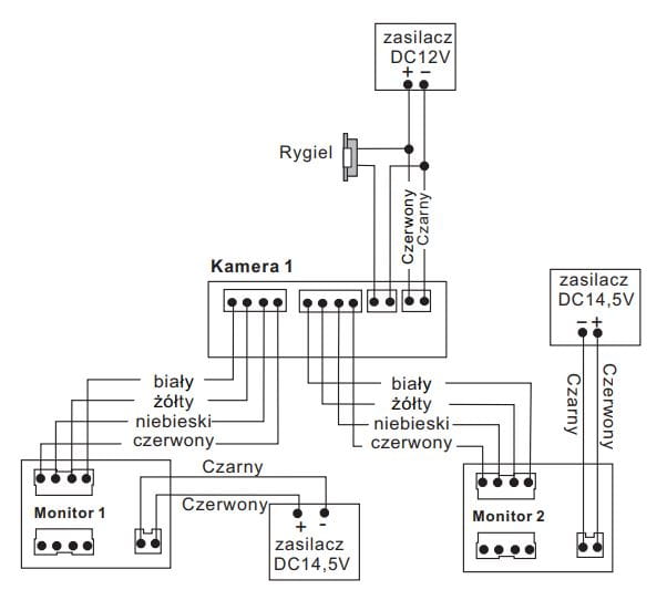 - Okablowanie: 4 przewody do kamery przy max 50m, ø0,5mm