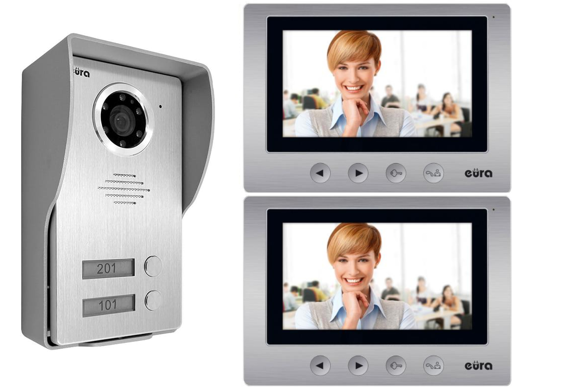 Zestaw wideodomofonowy kolorowy dwurodzinny marki EURA. W skład zestawu wchodzą - kamera 2-przyciskowa podtynkowa oraz dwa monitory kolorowe z wyświetlaczem LCD 7" oraz funkcją otwierania furtki oraz bramy automatycznej. Pamięć obrazów.