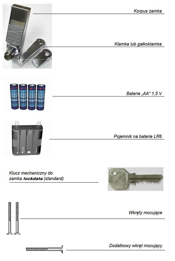 W opakowaniu powinny znajdować się następujące elementy elektronicznego zamka cyfrowego Lockdata: