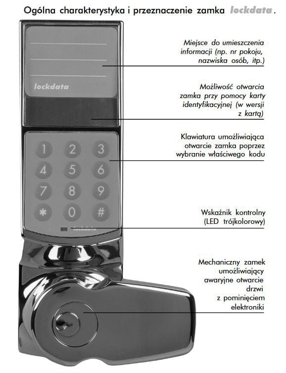 Elektroniczny zamek cyfrowy lockdata jest przeznaczony do kontroli dostępu do pomieszczeń wymagających ochrony przed osobami niepowołanymi. Wstęp do tych pomieszczeń jest możliwy tylko dla osób posiadających właściwe karty lub znających kody dostępu zamka cyfrowego. Stosowany jest do ochrony pomieszczeń w: bankach, biurach, hotelach, firmach, instytucjach, biurach projektów, szpitalach, a w szczególności do kontroli wejść pracowniczych, wejść do magazynów, pomieszczeń kasowych, laboratoryjnych, pomieszczeń zarządzania i sterowania procesami technologicznymi, serwerowni sieciowych, archiwów itp.