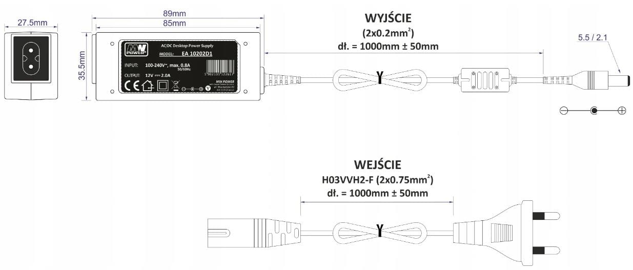 - Wtyk: 2.1/5.5 V + wewnątrz