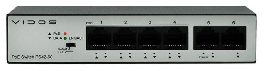 Przełącznik wyposażony jest w 4 porty ethernet wspierające technologie PoE ( Power Over Ethernet ) służącą do zasilania urządzeń w standardzie IEEE 802.3af/at. Dodatkowe Vidos PS42/60 wyposażono w 2 porty UPLINK służą do połączenia z siecią LAN lub rozszerzenia systemu o dodatkowe switche. Przełącznik CCTV umożliwia izolowanie portów przyspieszając przesył danych, zwiększając tym samym zasięg przesyłanego sygnały na porcie PoE do 250 m. Switch PS42/60 jest łatwy w instalacji i nie wymaga konfiguracji. Dzięki wyjątkowej wydajności i jakości jest idealnym urządzeniem do rozbudowy małej sieci domowej lub biurowej.